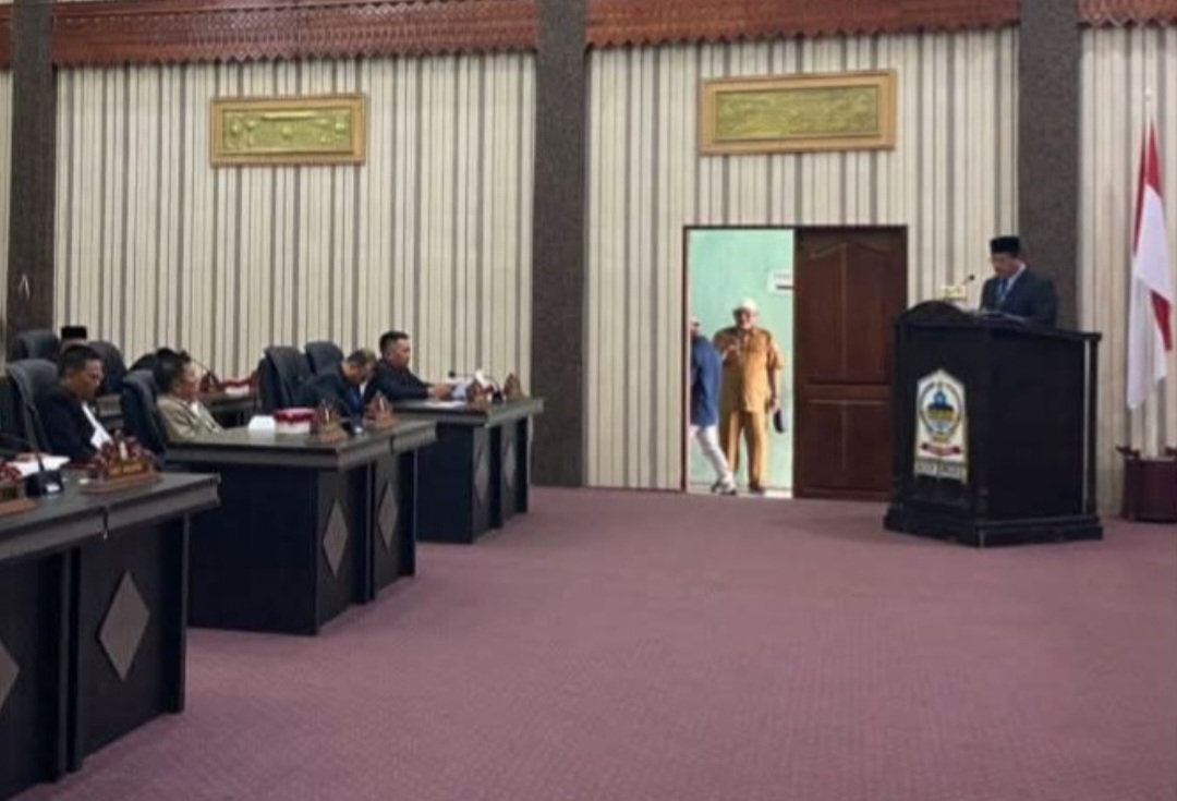 ACEH SINGKIL — Bupati Aceh Singkil, Safriadi Oyon, menyampaikan pengantar Nota Keuangan Rancangan Qanun Anggaran Pendapatan dan Belanja Kabupaten (RAPBK) Tahun Anggaran 2026 dalam sidang paripurna Dewan Perwakilan Rakyat Kabupaten Aceh Singkil, Selasa (3/3/2026).