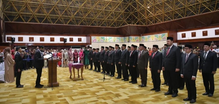 BANDA ACEH — Gubernur Aceh, Muzakir Manaf, melantik dan mengambil sumpah 25 pejabat pimpinan tinggi pratama (eselon II) di lingkungan Pemerintah Aceh, dalam prosesi di Anjong Mon Mata, Meuligoe Gubernur Aceh, Jumat (27/2/2026) malam.