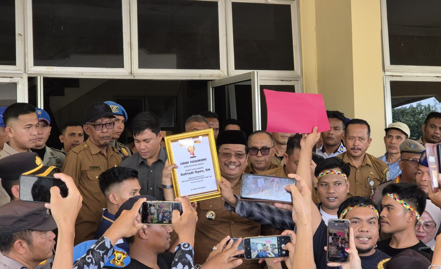 Sebagai bentuk kritik, massa menyerahkan sebuah piagam bertajuk “Penghargaan Rekor Miring” kepada Bupati Aceh Singkil. Piagam tersebut merupakan simbol sindiran terhadap kinerja pemerintah daerah yang dinilai belum memenuhi harapan masyarakat.